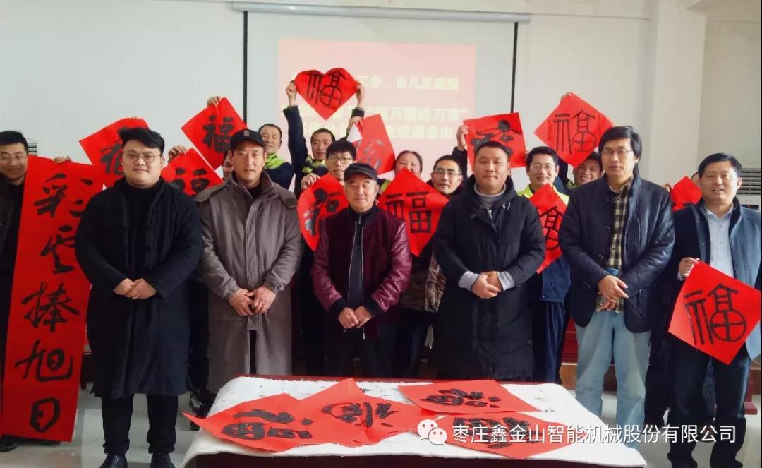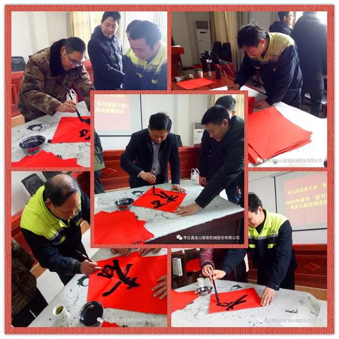 新春將至,為深入宣傳習(xí)近平新時(shí)代中國(guó)特色社會(huì)主義思想和黨的十九屆四中全會(huì)精神,弘揚(yáng)中華優(yōu)秀傳統(tǒng)文化,增強(qiáng)職工的幸福感,營(yíng)造文明、健康、祥和的節(jié)日氛圍。1月10日上午,臺(tái)兒莊區(qū)總工會(huì)、臺(tái)兒莊畫(huà)院組織優(yōu)秀書(shū)法家走進(jìn)鑫金山,開(kāi)展2020年春節(jié)“送萬(wàn)福進(jìn)萬(wàn)家”書(shū)法公益活動(dòng),為鑫金山員工們現(xiàn)場(chǎng)書(shū)寫(xiě)“福”字和春聯(lián),送上了歡樂(lè)和春節(jié)祝福。